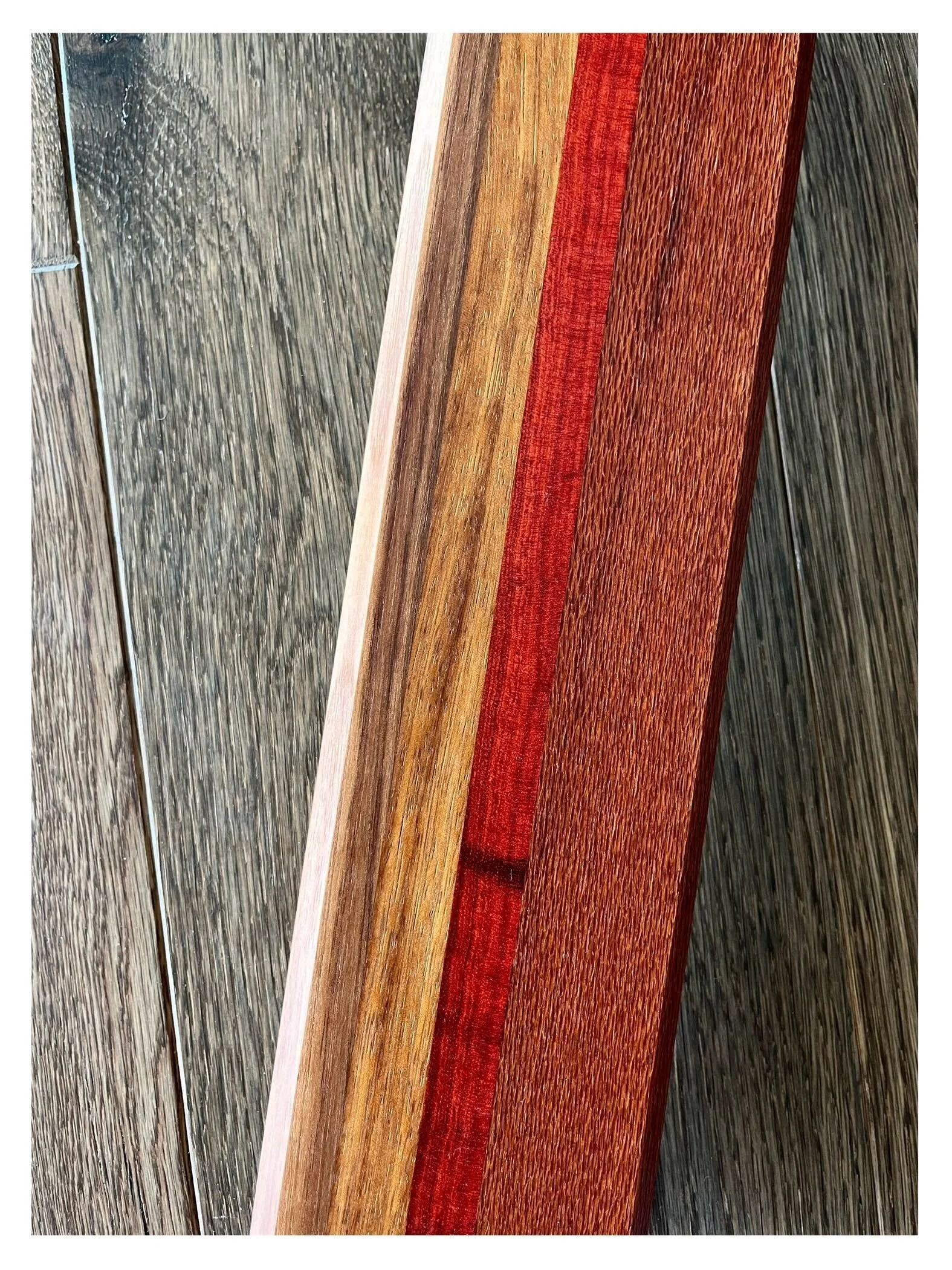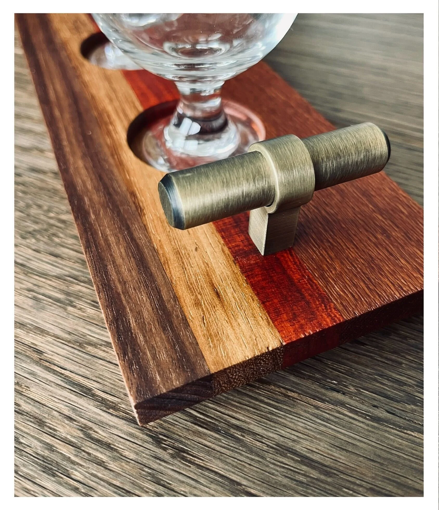 Flight Board no. 1271 board x 4 tastersWALNUT + IROKO+ REDHEART + LEOPARDWOOD + ANTIQUE BRUSHED BRASS hardware