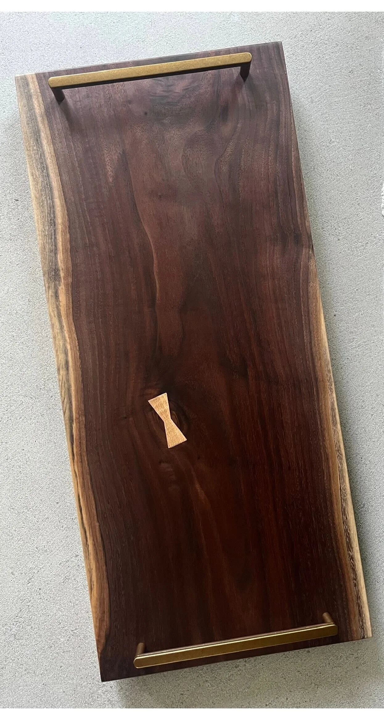 Serving Board no. 18811 in x 24 1/2 inSOLID BLACK WALNUT WITH TIGER MAPLE + WALNUT BOWTIE INLAYS + BRASS HARDWARE